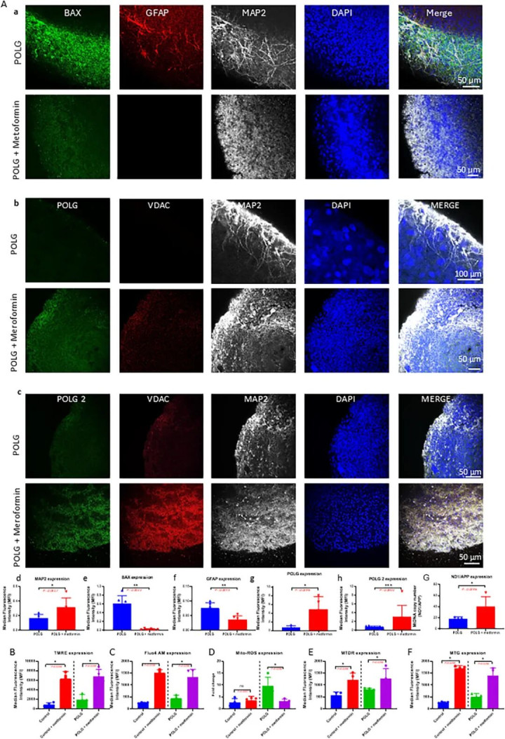 https://advanced.onlinelibrary.wiley.com/doi/10.1002/advs.202417721 线粒体DNA的合成与修复:Polγ不可或缺性 01 DNA 聚合酶γ(Polγ)是线粒体 DNA(mtDNA)的主要复制聚合酶,还在多种 mtDNA 修复途径中发挥着关键作用。人类的 POLG 和 POLG2 基因分别位于 15q26.1 和 17q24.1 染色体上,分别编码 Polγ 的催化亚基和辅助亚基。作为全酶,Polγ 由执行 DNA 聚合作用的 POLG 催化亚基和增强连续性的 POLG2 辅助亚基组成。这种酶在维持线粒体基因组的完整性和功能方面发挥着核心作用。Polγ 对线粒体生物发生过程中 mtDNA 的合成至关重要,还能修复因代谢活动和氧化应激而累积的 mtDNA 损伤。鉴于线粒体拥有自身的基因组,准确的复制和修复对于维持能量产生和整体细胞稳态至关重要,尤其是在大脑和肌肉等能量需求高的组织中。 二甲双胍恢复POLG脑类器官线粒体功能与神经元完整性 02 研究人员先前证实二甲双胍能显著改善线粒体膜电位、ATP输出和mtDNA拷贝数。从机制上看,二甲双胍通过激活AMPK和SIRT3、抑制mTOR、增强线粒体生物发生与融合(如PGC-1α、OPA1)并促进线粒体自噬(LC3B、BNIP3)发挥作用。 为了评估POLG来源的皮质类器官的线粒体功能、神经元完整性及细胞应激状态,研究人员采用关键标志物进行了免疫荧光染色分析。与未经处理的POLG类器官相比,经二甲双胍处理的POLG类器官显示出BAX、cleaved caspase 3和GFAP信号显著降低,提示细胞凋亡减少和反应性星形胶质细胞增生减弱。相应地,MAP2表达水平升高,表明神经元再生能力增强。此外,经二甲双胍处理后,POLG与POLG2类器官中的POLG蛋白含量均有所提升,且处理组样本的VDAC信号强度高于未处理组。定量分析证实了这些发现,显示经二甲双胍处理的类器官中BAX、cleaved caspase 3和GFAP表达显著降低,同时MAP2水平上升。这些结果表明,二甲双胍能减轻细胞应激,并在POLG突变皮质类器官中促进神经元存活。 为深入评估线粒体功能,研究人员使用一组线粒体特异性荧光探针对皮质类器官进行了流式细胞分析。研究人员进一步研究了二甲双胍对线粒体DNA维持的作用。通过ND1/APP比值的qPCR分析,发现二甲双胍处理使POLG类器官的线粒体DNA拷贝数显著增加。 综合这些结果表明,二甲双胍可缓解线粒体功能障碍并恢复mtDNA拷贝数,减少氧化和钙相关的细胞应激,同时支持POLG患者来源的皮质类器官中的线粒体维持和神经元恢复。