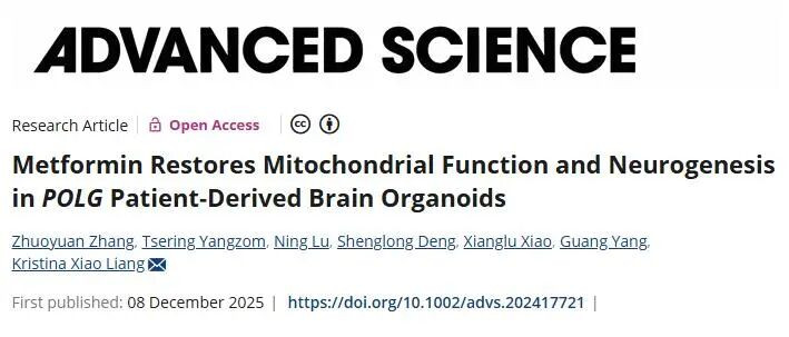 【导读】线粒体功能障碍和神经发生受损是线粒体DNA聚合酶(POLG)相关疾病的核心病理机制,但目前治疗选择仍然有限。 近日,挪威卑尔根大学研究学者在期刊《Advanced Science》上发表了研究论文,题为“Metformin Restores Mitochondrial Function and Neurogenesis in POLG Patient-Derived Brain Organoids”,本研究中,研究人员利用源自患者的诱导多能干细胞(iPSC)构建的皮质类器官被用于模拟 POLG 相关神经退行性疾病,并评估二甲双胍的治疗潜力。单细胞 RNA 测序揭示了多巴胺能、谷氨酸能和γ-氨基丁酸能神经元亚型存在不同的脆弱性,其中多巴胺能神经元表现出最严重的损失和线粒体转录组缺陷。二甲双胍治疗(250 微摩尔,2 个月)显著恢复了神经元身份、亚型特异性基因表达和线粒体功能。这些发现共同表明,二甲双胍能够增强多种神经元亚型的线粒体完整性和神经功能,并为二甲双胍作为治疗 POLG 相关疾病的一种潜在疗法提供了机制上的见解。